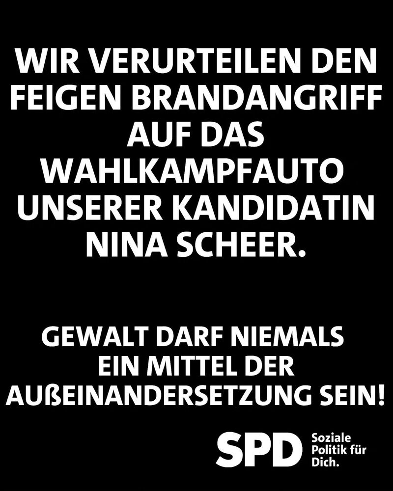 In der vergangenen Nacht ist es zu einem Brandanschlag auf das beklebte Wahlkampf-Fahrzeug unserer wieder antretenden Bundestagsabgeordneten Dr. Nina Scheer auf einer öffentlichen Straße in Büchen gekommen. Dabei wurde das Auto soweit zerstört, dass es nicht mehr zu gebrauchen ist, glücklicherweise kamen keine Menschen dabei zu Schaden.