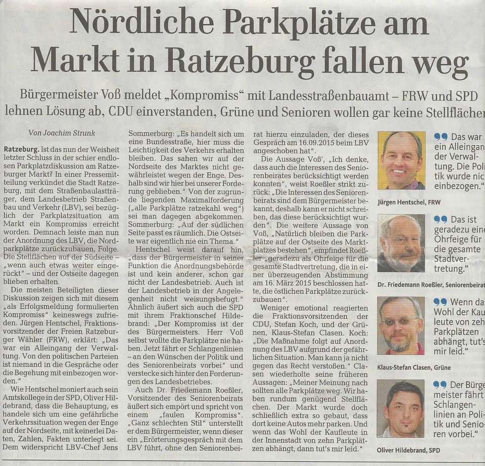 Am 16.03. dieses Jahres beschloss die Stadtvertretung mit 20 Ja - zu einer Nein – Stimme, dass die Parkmöglichkeiten auf der Nord- und Südseite des Marktplatzes erhalten bleiben, während die auf der Ostseite entfallen sollten. Eine Initiative des Seniorenbeirates, alle Parkplätze auf dem Marktplatz zurück zu bauen, scheiterte somit. Diesem Kompromiss, der aufgrund eines Vorschlages aus unserer Fraktion zustande kam, lag zu Grunde, dass so der wohl schönste Blick auf den Platz, und zwar aus Richtung Langenbrücker Straße Richtung „Altes Kreishaus“, unverstellt erhalten bliebe und den Bürgern und Geschäften an den Rändern ausreichend zusätzlicher Parkraum für „schnelle Besorgungen“ zur Verfügung stünde. Der Ratzeburger Bürgermeister, für den dieser Beschluss aufgrund der geltenden Rechtslage „Empfehlungscharakter“ hatte bzw. hat, setzte diesen nicht um und erklärte, dass er sich an die Empfehlung der Stadtvertretung nicht halten werde. So hatte sich bis vor kurzem an der Parkplatzsituation nichts geändert.