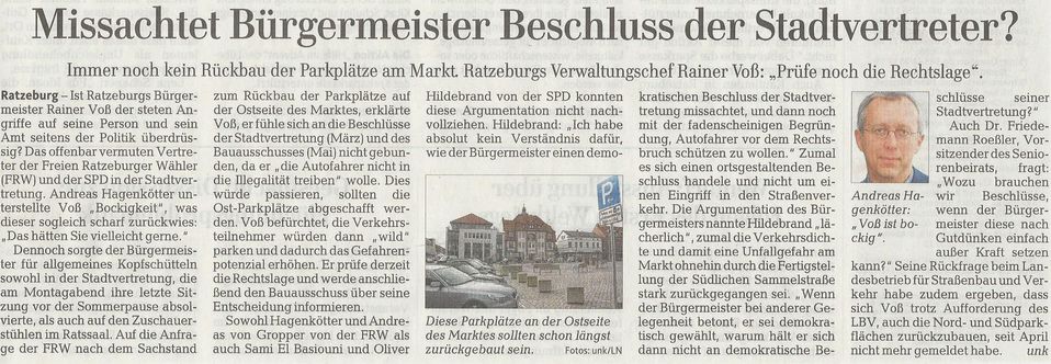 Sehr unzufrieden ist die Ratzeburger SPD derzeit hinsichtlich der Zusammenarbeit mit dem hiesigen Bürgermeister Rainer Voß (siehe oben stehender Bericht aus den Lübecker Nachrichten vom 24.06.2015). Wir stellen uns die Frage, warum er seinen Pflichten nach der Gemeindeordnung nicht nachkommt.
